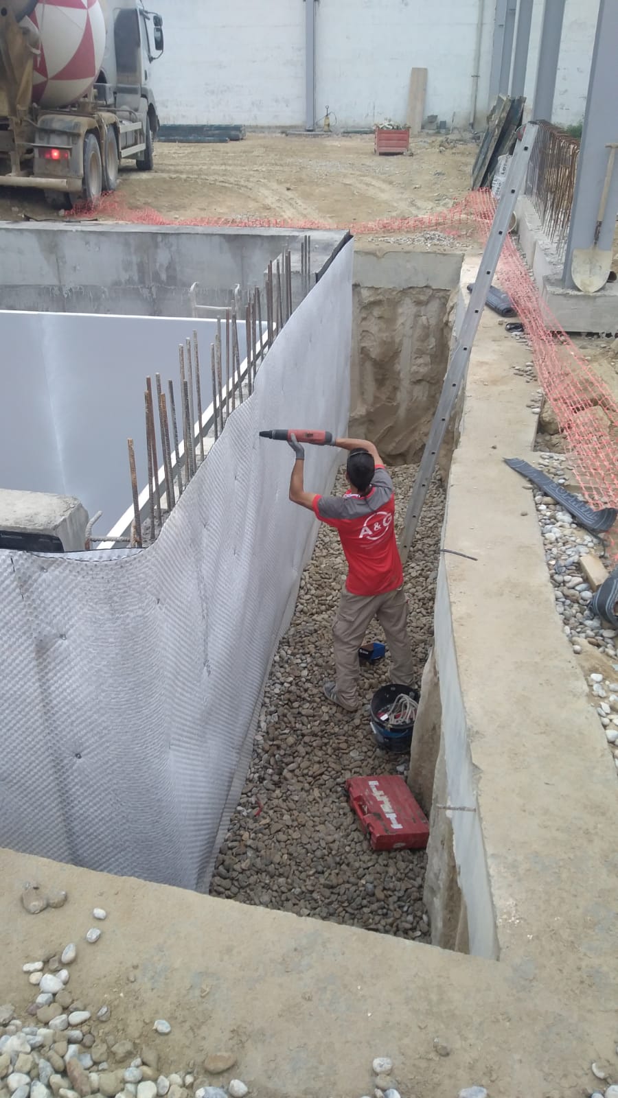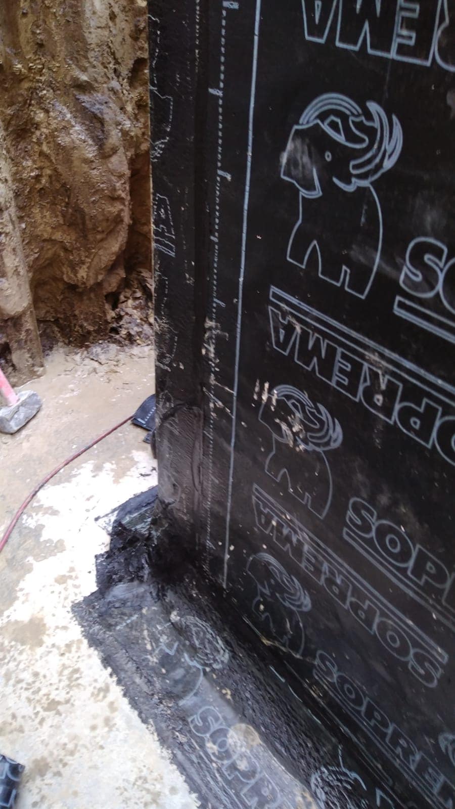 Otra de nuestras últimas intervenciones ha sido en Barbastro. En este caso se trataba de la impermeabilización y drenaje de un trasdós de muro. Para este trabajo optamos por trabajar con imprimiación bituminosa de base disolvente, sobre la que colocamos una lámina de betún modificado. Colocamos una capa drenante y filtrante formada por una lámina de polietileno por encima.