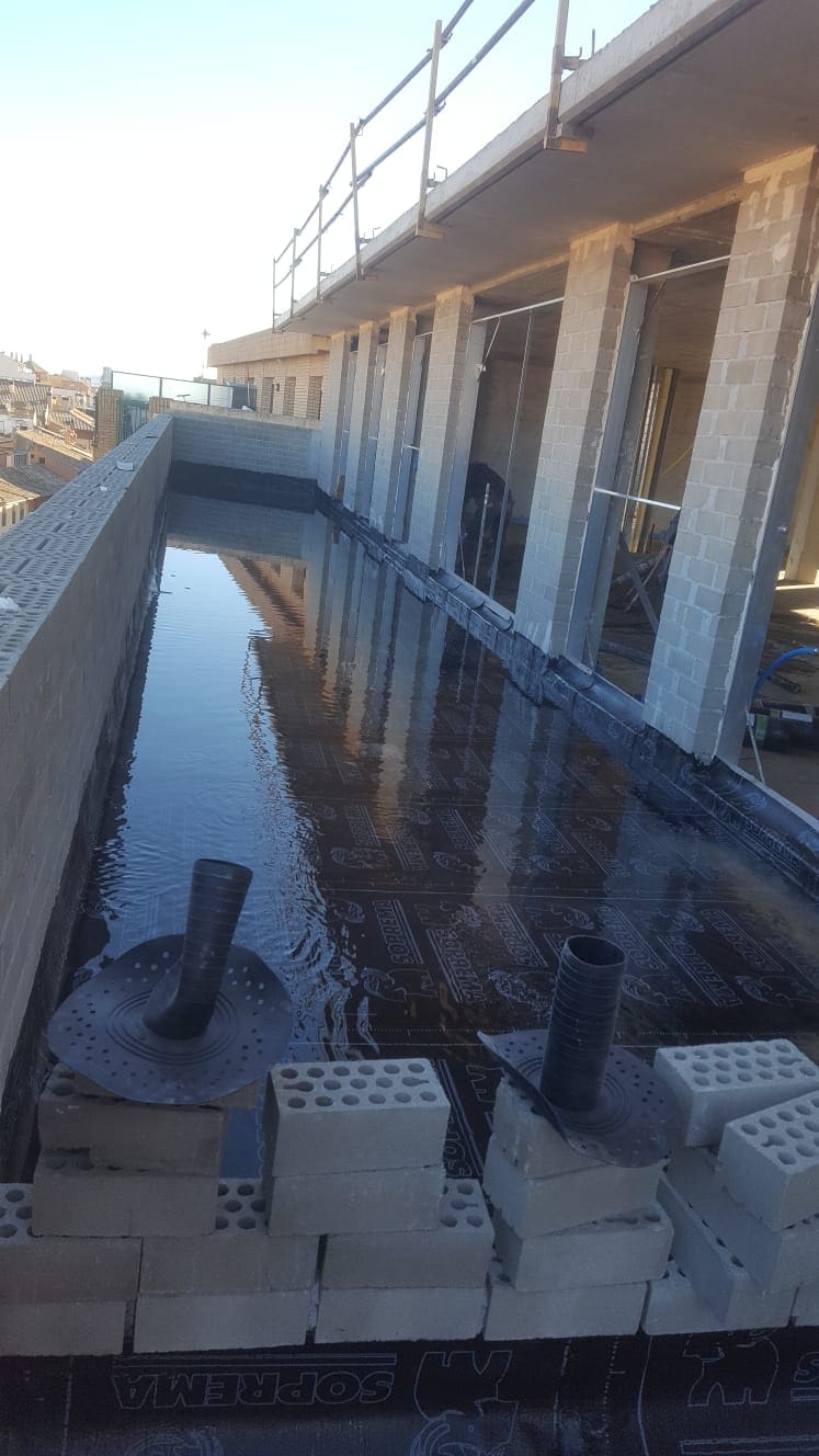 Por eso, aquellos constructores y promotores que buscan la excelencia confían en Arizón&Gracia para impermeabilizar las cubiertas y terrazas de aquellas edificaciones de alta calidad que requieren los mejores materiales y acabados. Recientemente hemos impermeabilizado un edificio de nueva construcción en Huesca, para el que hemos elegido también productos de nuestro partner Soprema y en el que por supuesto, como parte de nuestra garantía, hemos hecho las pruebas de estanqueidad que os enseñamos en estas imágenes.